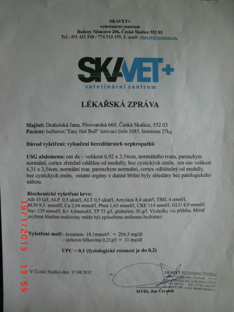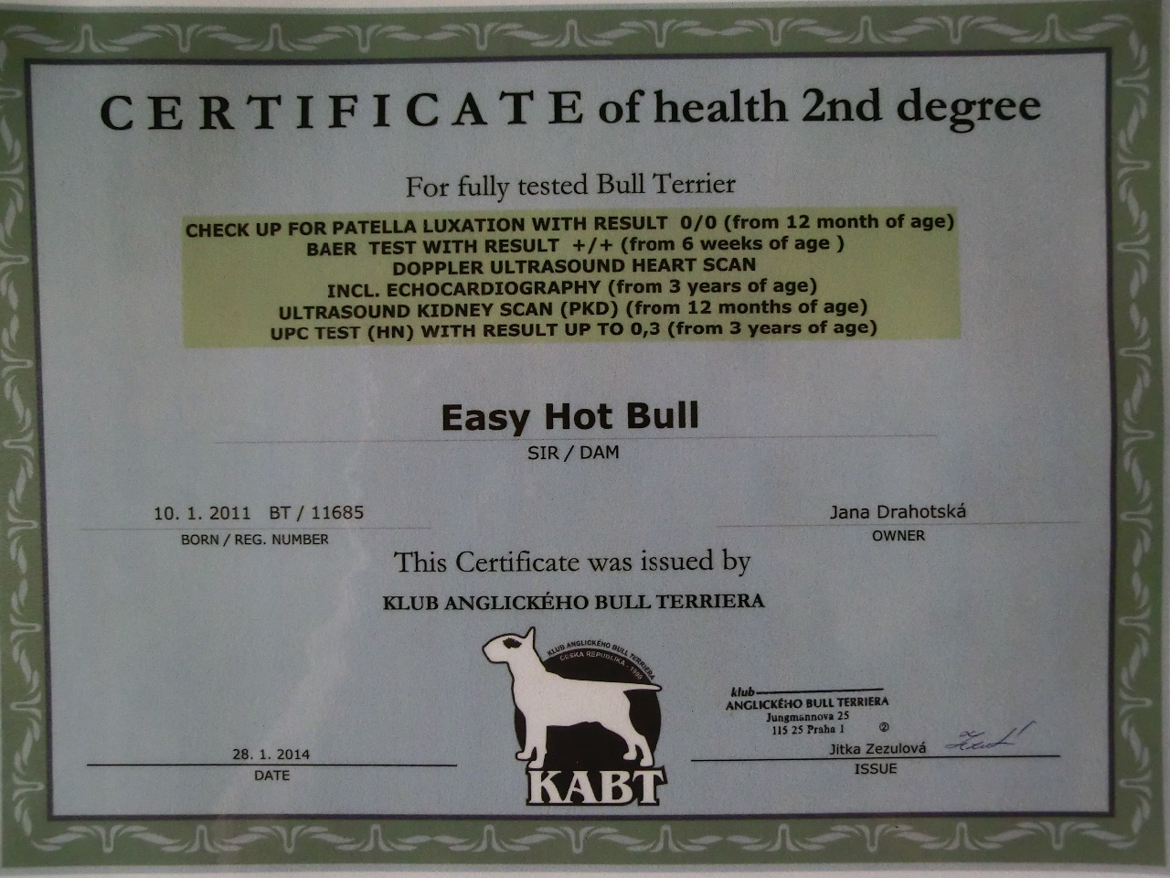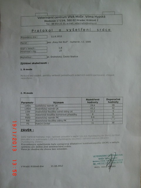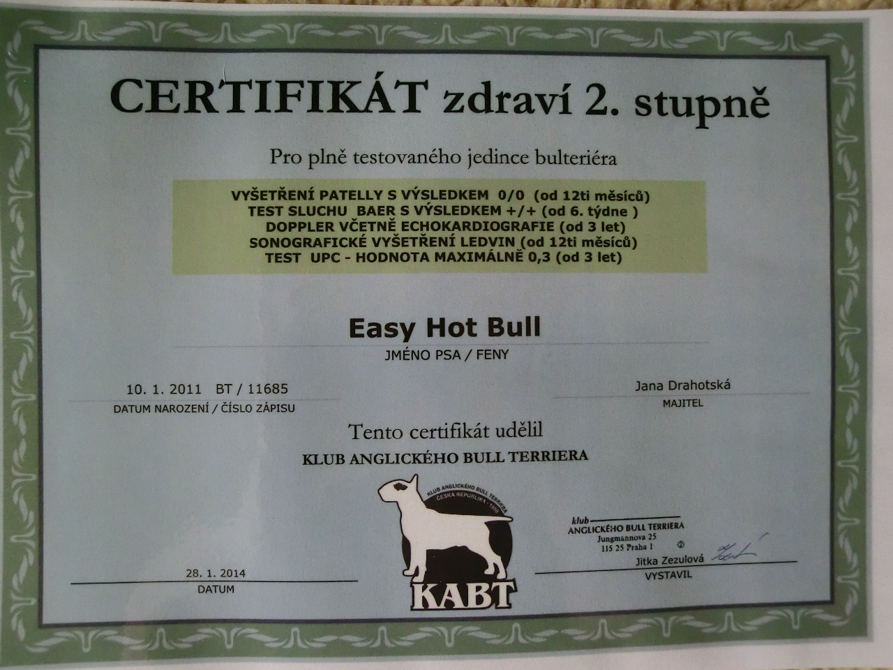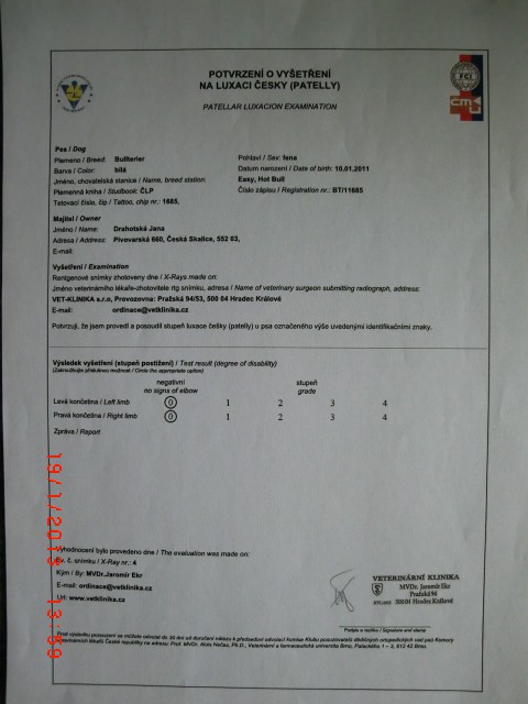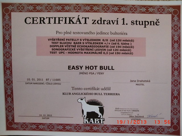 Easy byl 14.12.2012 udělen CZDR I Jako potvrzení že máme zdravého bulíka jsme absolvovali na třech letech naší Easy zdravotní testy a byl nám udělen 28. 1 .2014 certifikát CZDR ll (Certifikát zdráví 2. Stupně).